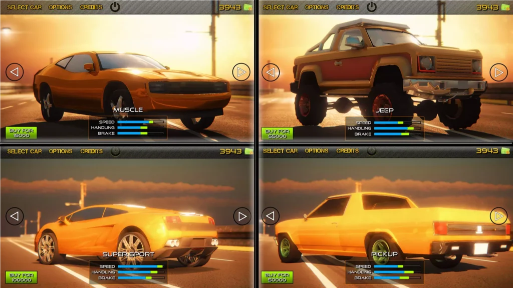 8つの車を選択可能、ゲームモードは4つ選択可能。