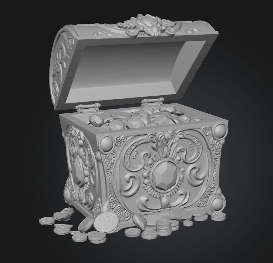 Stylized fantasy treasure box, gold and wood, hand-painted style, high detail