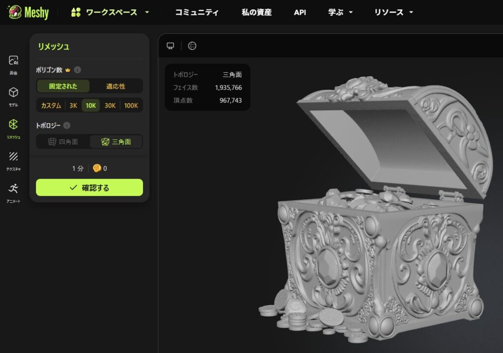 生成された直後のモデルはポリゴン数が多い場合があります。Meshyの「Edit」メニューからリメッシュを実行しましょう。